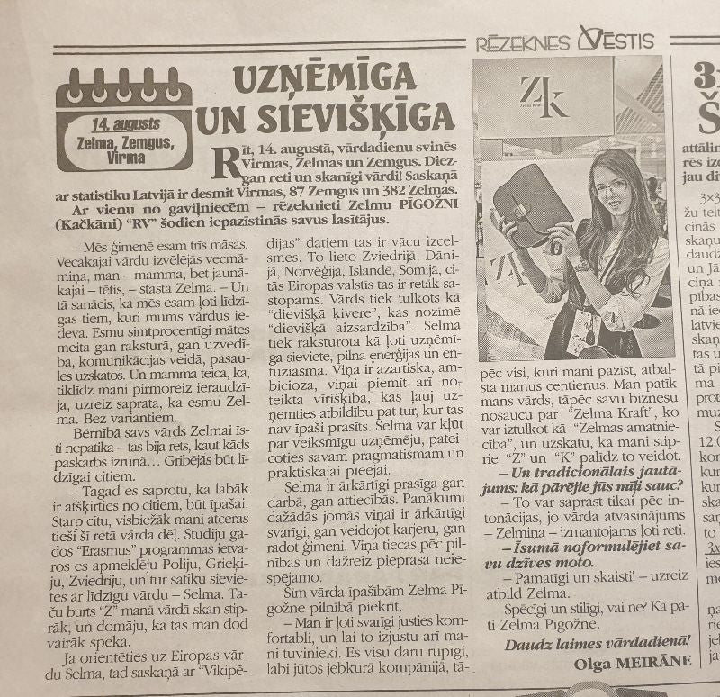 Es esmu Zelma Pīgožne, Zelma Kraft radošais prāts. Mana aizraušanās ar dizainu sākās jau agrā bērnībā, kad es nepārtraukti skicēju un radīju. Kļūstot vecākai, aizraušanās ar dizainu tikai pastiprinājās, un es zināju, ka tas ir ceļš, kuru vēlos iet.