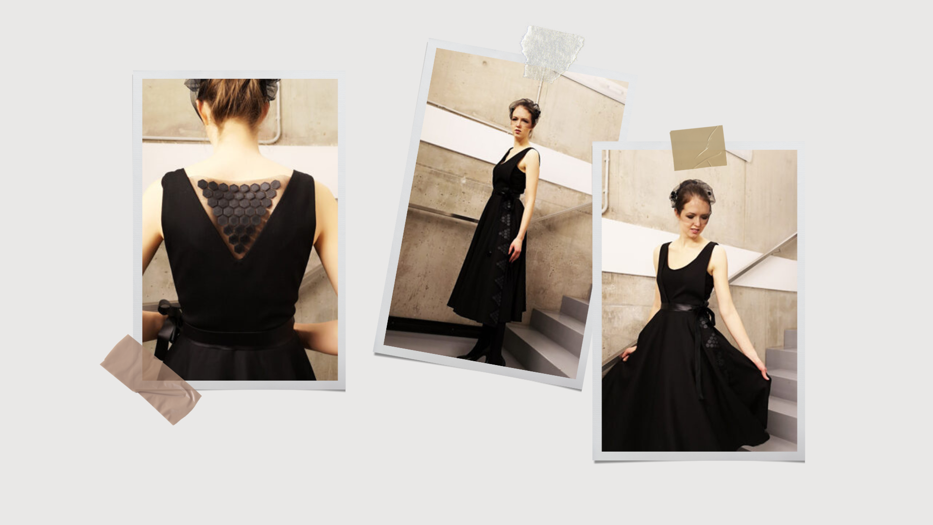 Pieguļoša augšdaļa, kas izceļ sievietes figūru un stāju. Saules piegrieztie svārki liek svārkiem plīvināties un virzīties pa sievietes gaitu, radot pasauli sev apkārt. X formas siluets piešķir sievietei ideālu formu, lai viņa būtu eleganta un pašpārliecināta. Melnas krāsas audums nodrošina daudzfunkcionālu lentes kleitas pielietojumu, un 3D druka kostīmā rada zibens spēli, piešķirot tam unikālu dizainu.