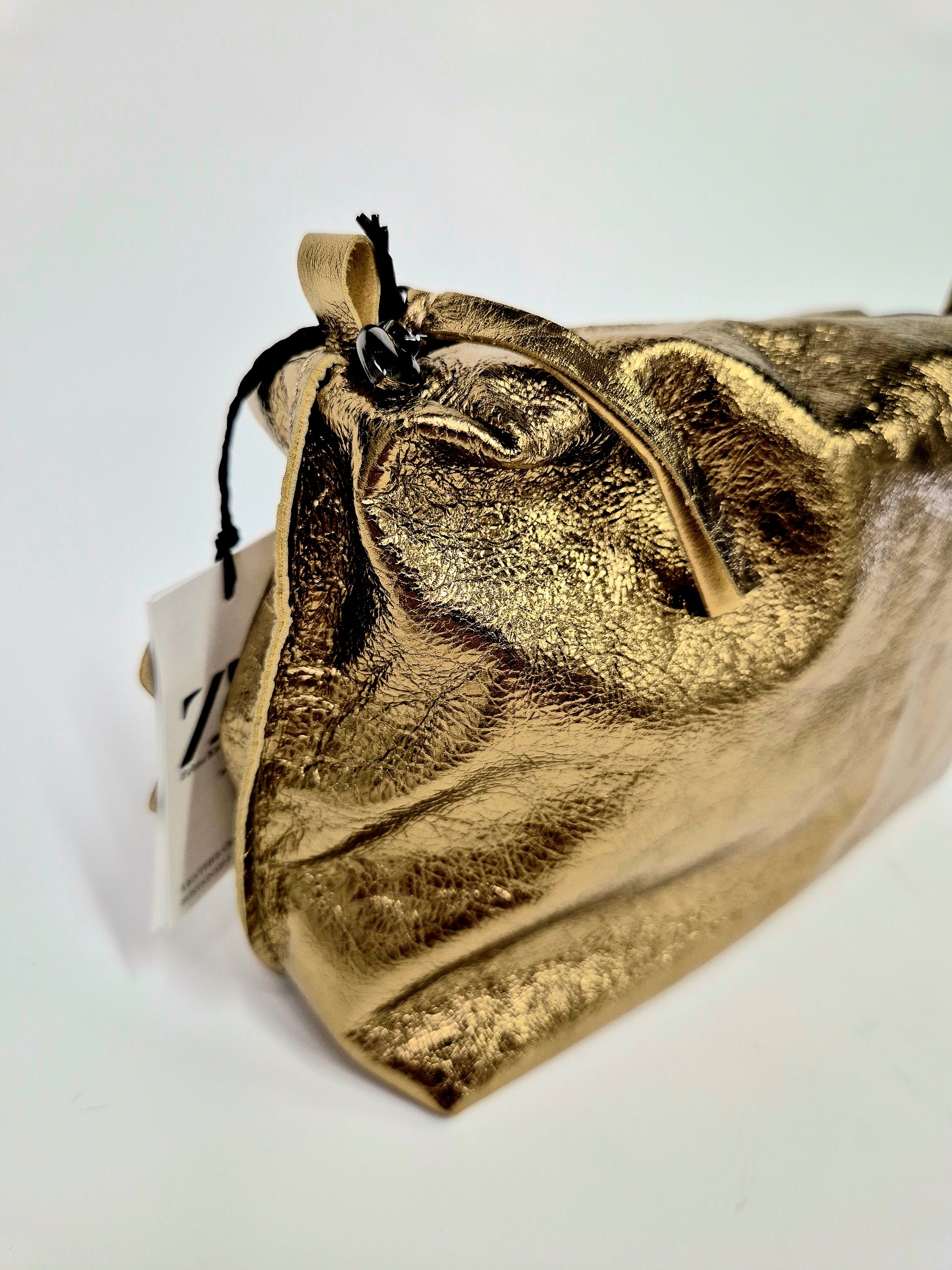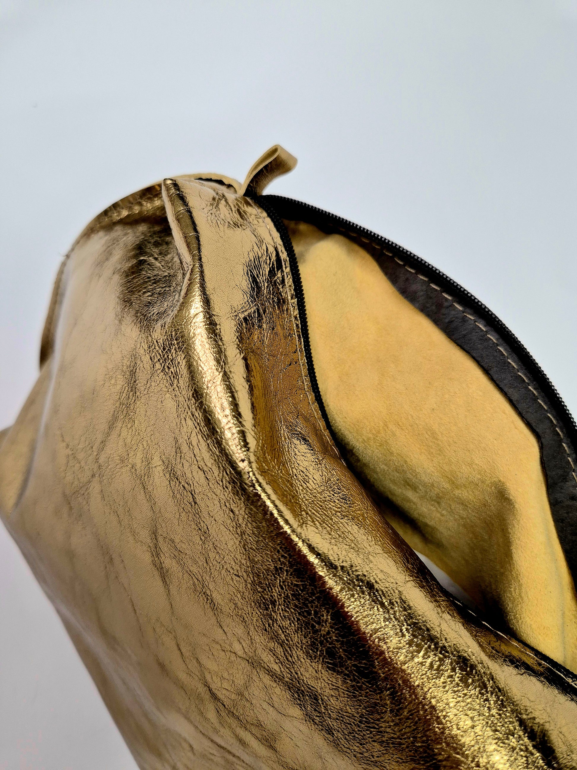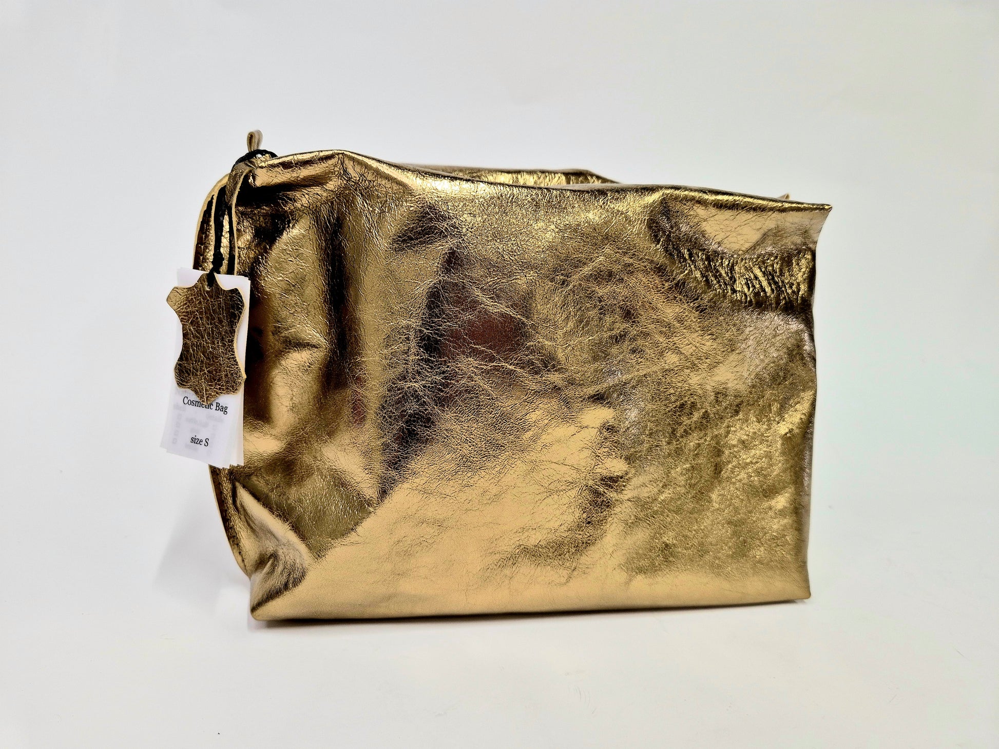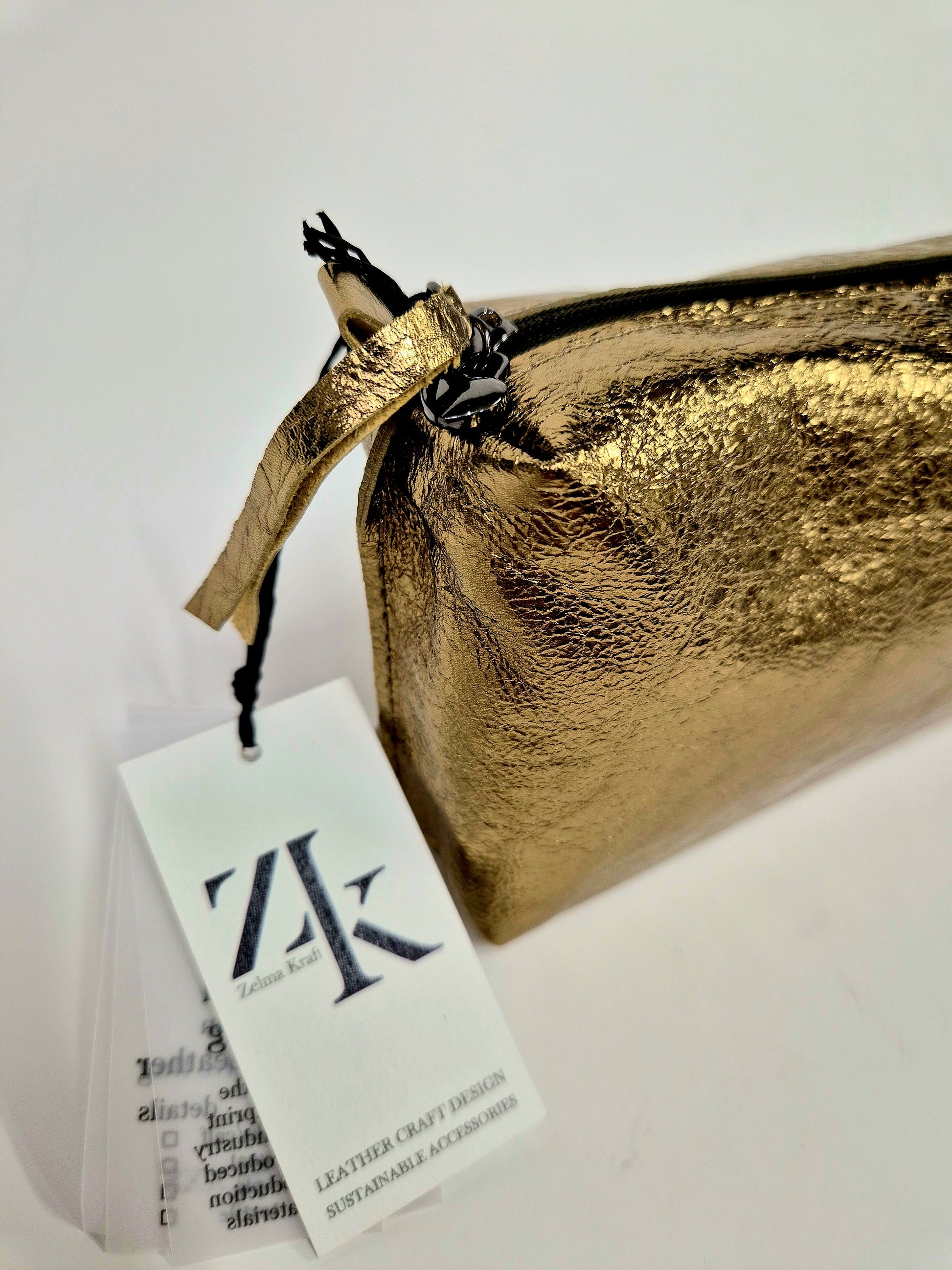 Ar rokām darināts ādas kosmētikas maks/organizators; tikai āda un metāls. Rāvējslēdzēja aizdare. Viena iekšējā kabata.