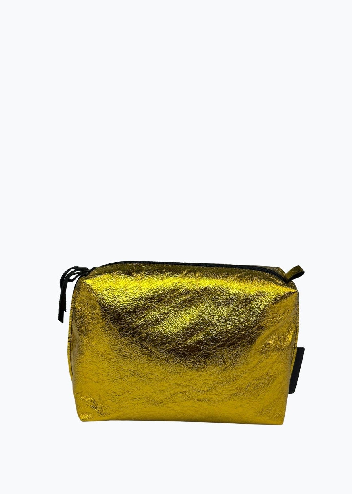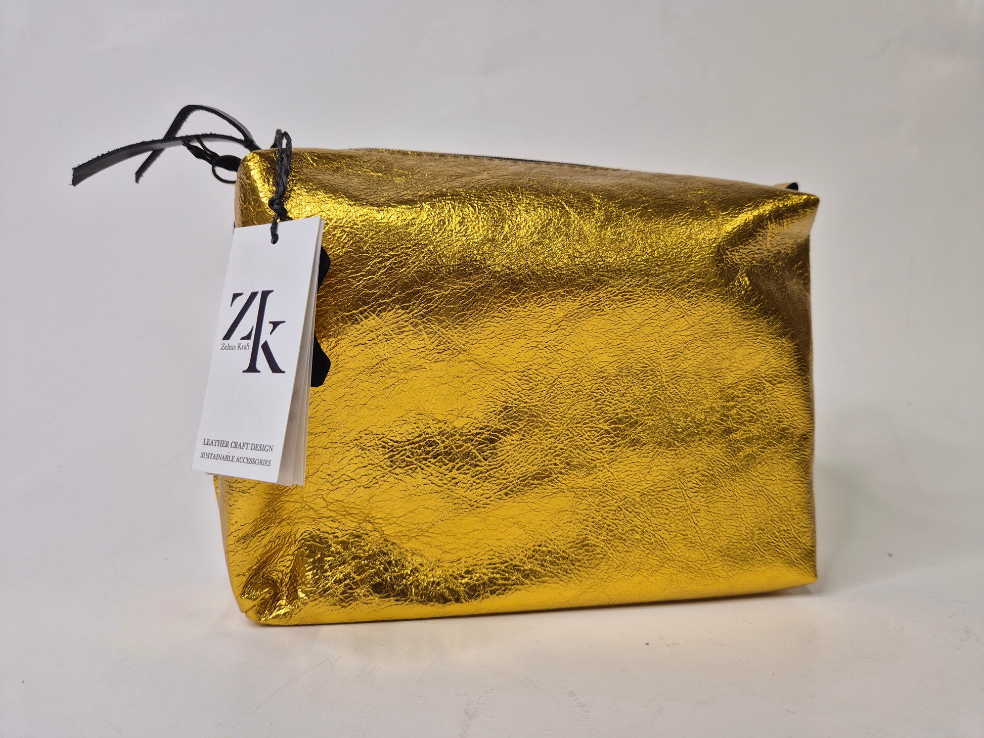 Ar rokām darināts ādas kosmētikas maks/organizators; tikai āda un metāls. Rāvējslēdzēja aizdare. Viena iekšējā kabata.