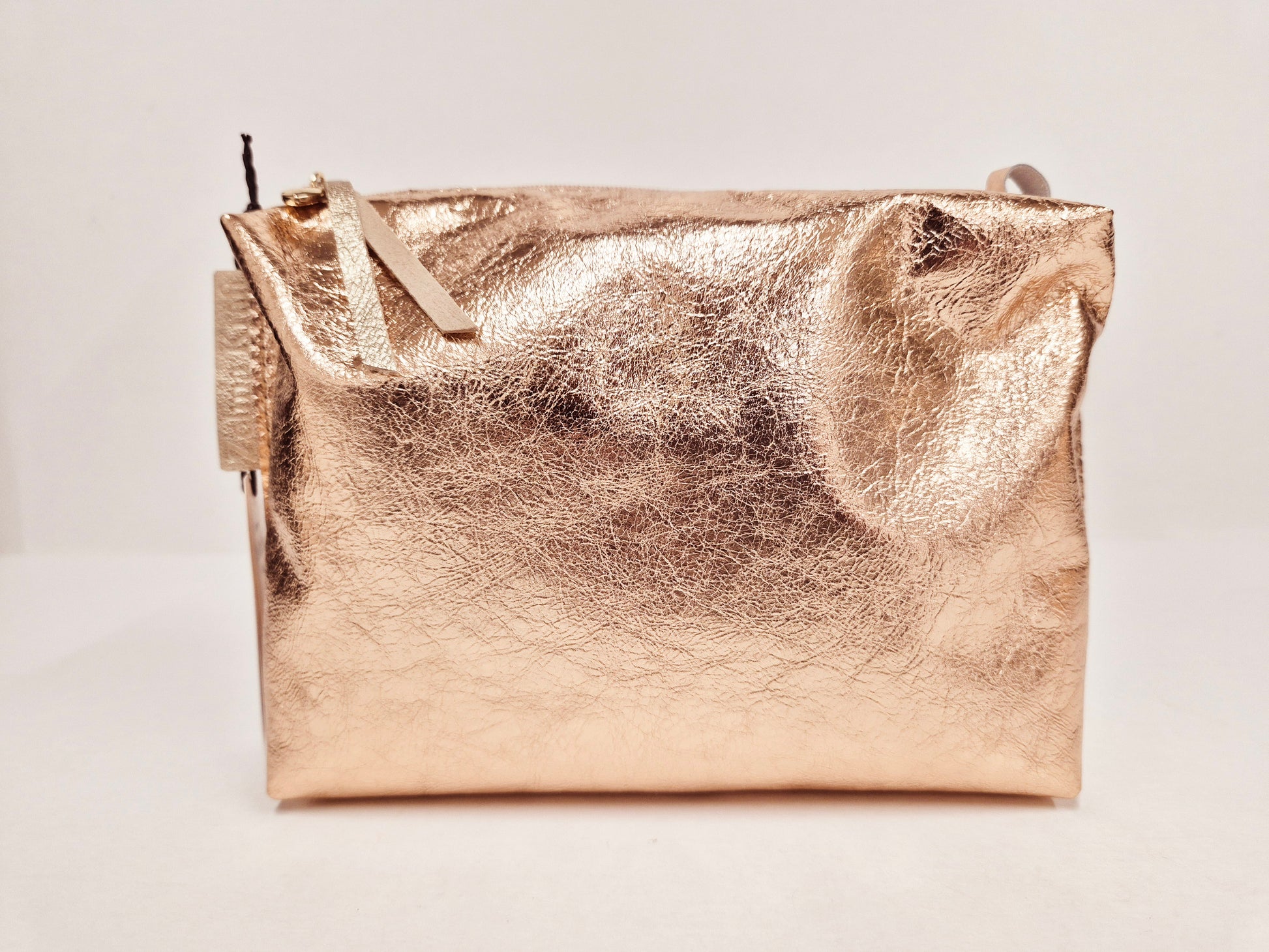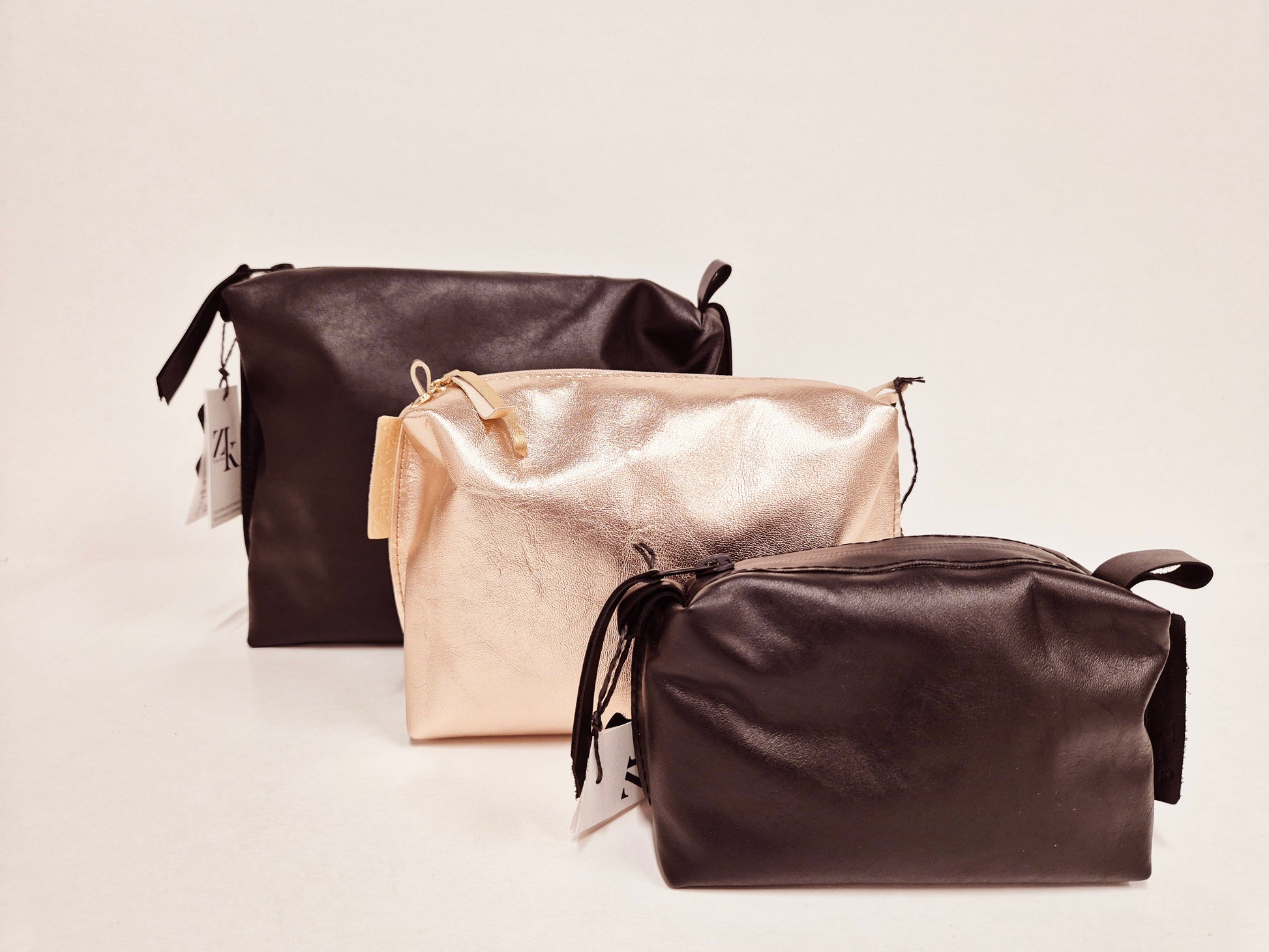 Ar rokām darināts ādas kosmētikas maks/organizators; tikai āda un metāls. Rāvējslēdzēja aizdare. Viena iekšējā kabata.