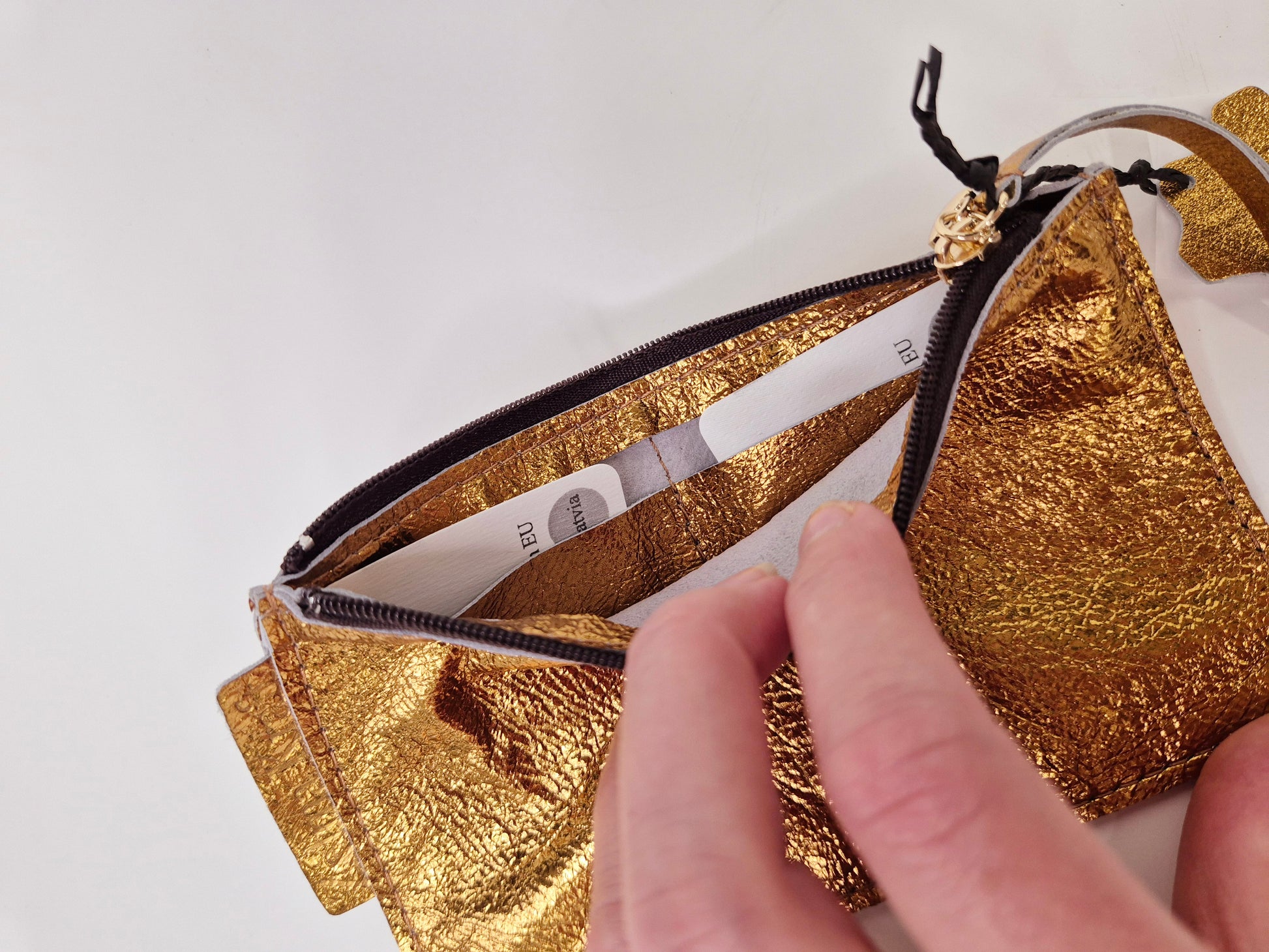 - Внутри два дополнительных кармана для кредитных карт и мелочей