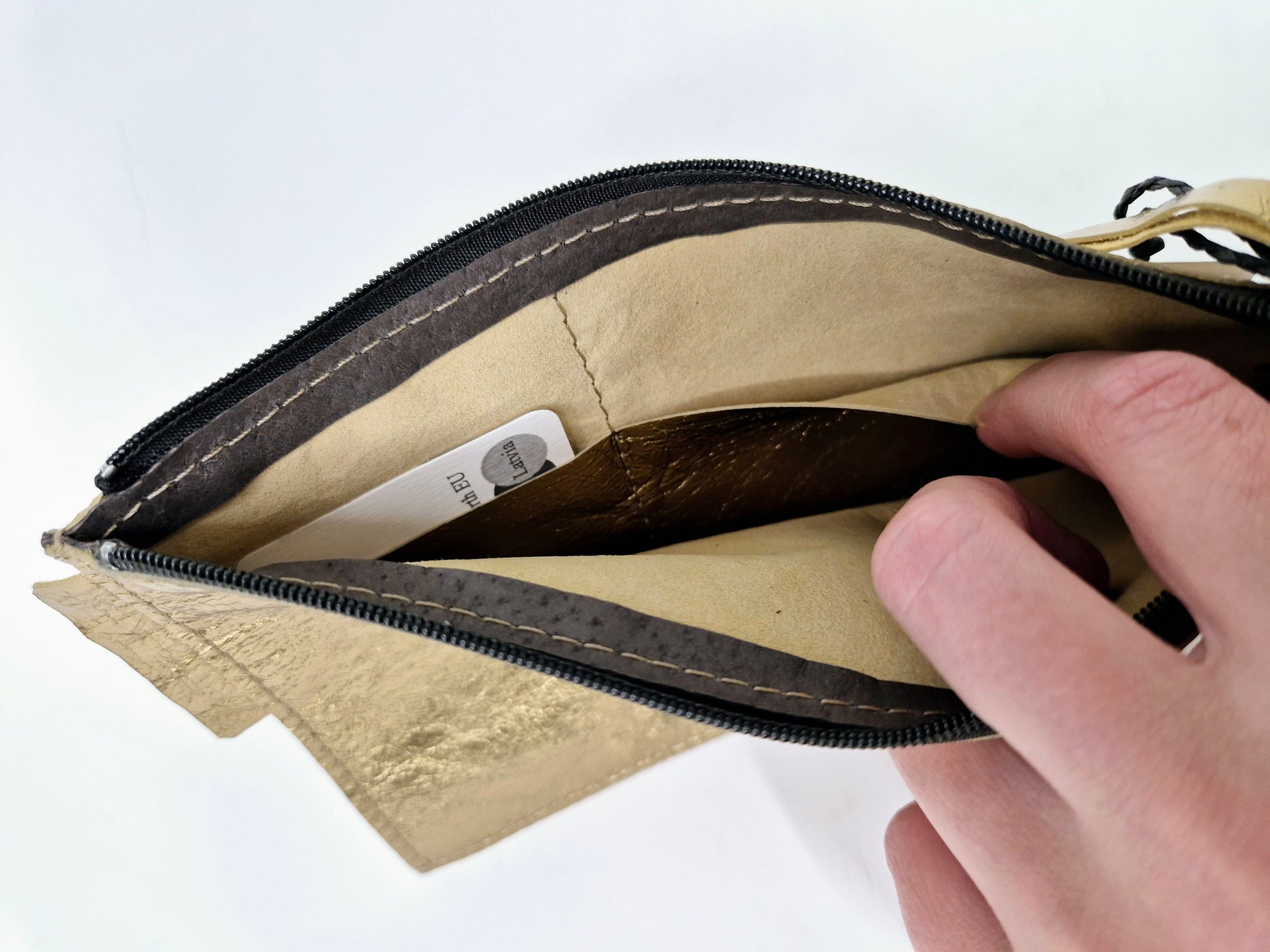 - Внутри два дополнительных кармана для кредитных карт и мелочей