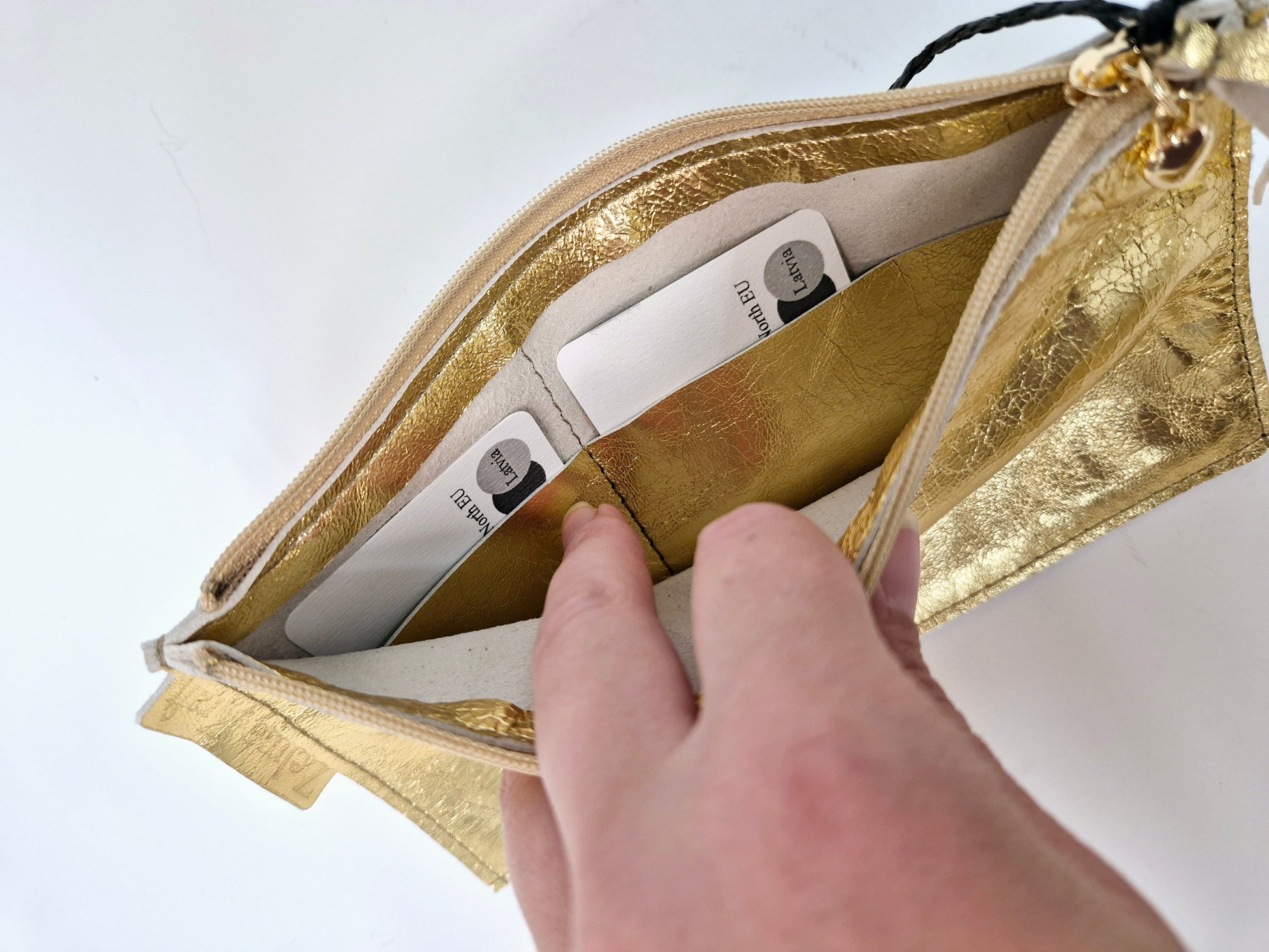 - Внутри два дополнительных кармана для кредитных карт и мелочей