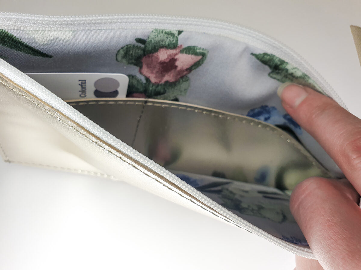 - Внутри два дополнительных кармана для кредитных карт и мелочей
